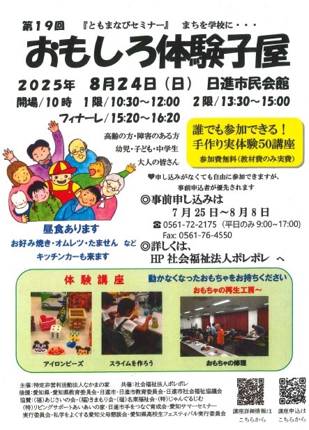 | 8/24(日) | おもしろ体験小屋 | NPOなかまの家 | ハーモニー(折戸町梨子ノ木28番地157) | ||||