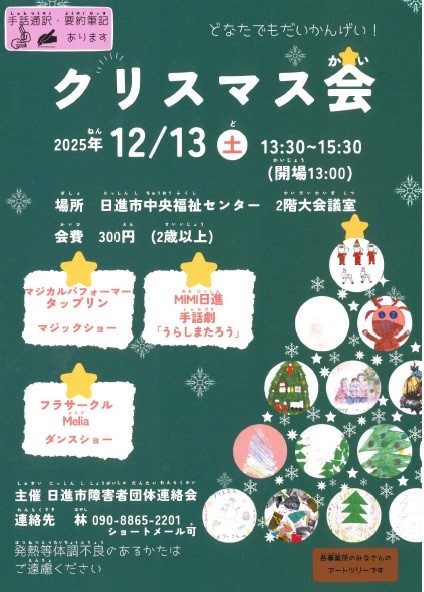 | 12/13(土) | クリスマス会 | 日進市障害者団体連絡会 | 日進市中央福祉センター(蟹甲町中島22) | ||||